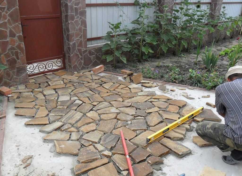 После укладки нескольких плиток вы почувствуете себя в таком деле, как мощение природным камнем своими руками, настоящим мастером. Следите за тем, чтобы между ними не было перепадов, с помощью клеевой смеси вы всегда сможете поднять плитку на нужный уровень. Больше сложностей в укладке натурального камня вы не встретите.
