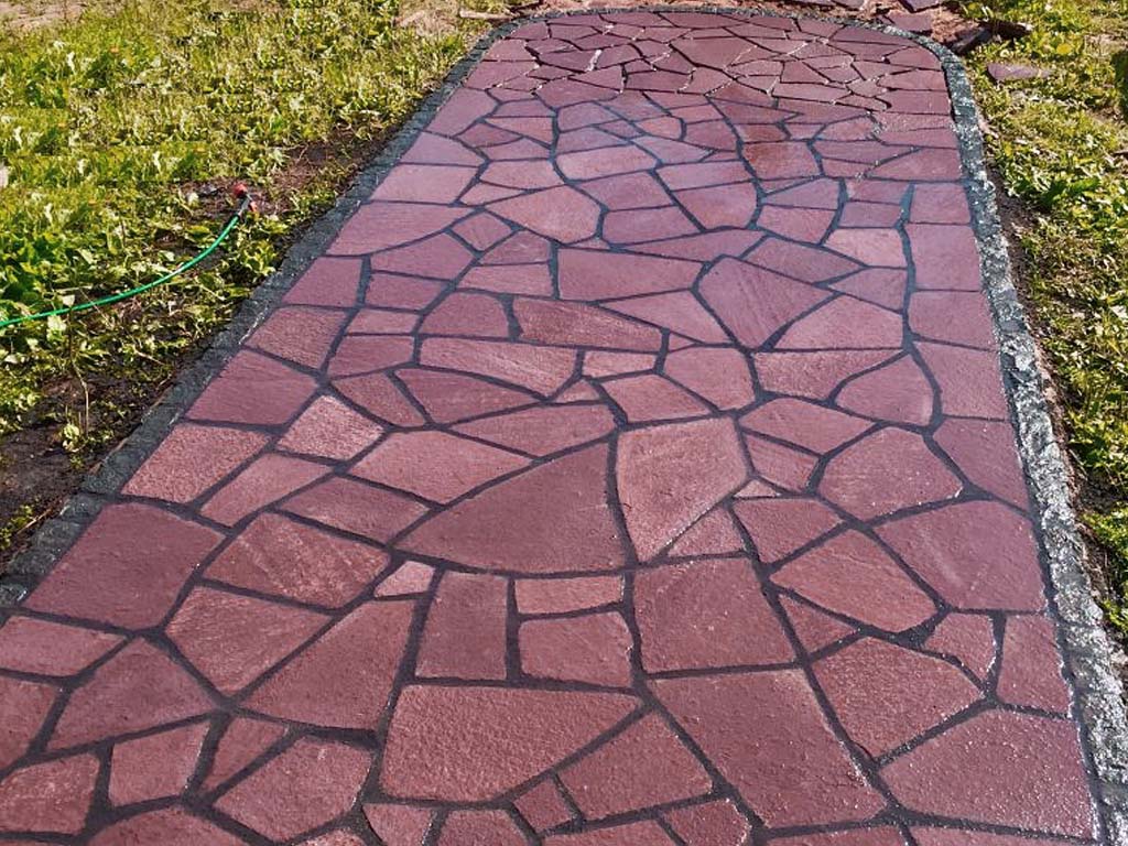 Установщик проделал хорошую работу по прокладке гладкой дорожки с небольшим утолщением , чтобы вода могла стекать с дорожки в целях безопасности.Цвета каменной плиты варьируются от серого до светло-зеленого и красного цвета оксида железа.