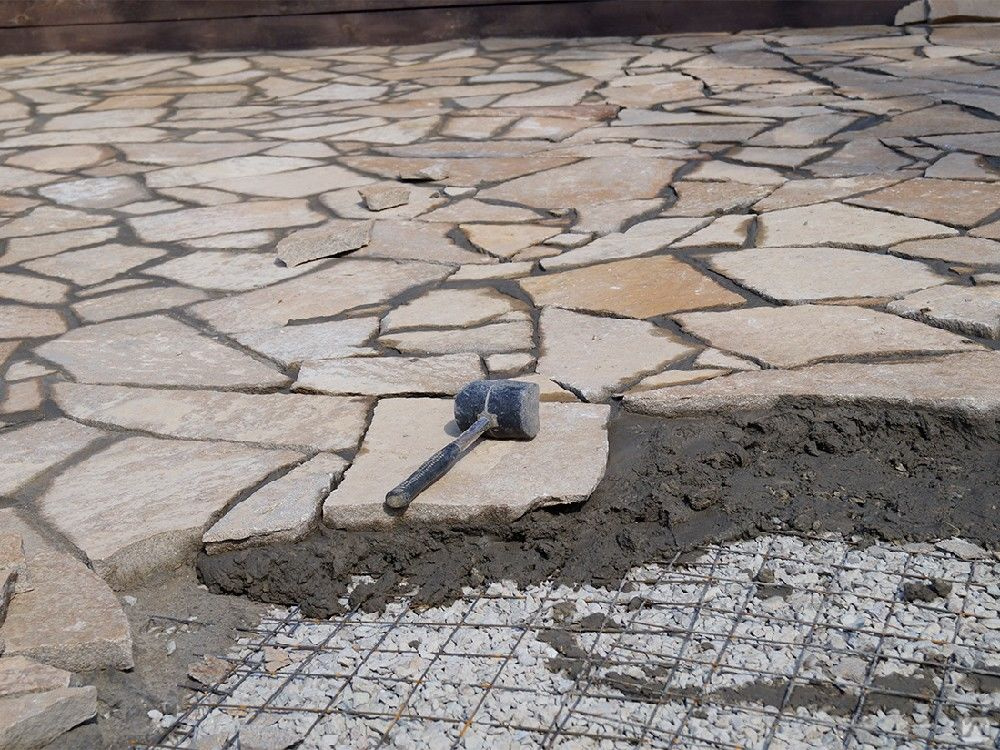 Важной частью подготовительных работ является правильная подготовка несущего бетонного основания. Для начала, с целью предотвращения выхода из бетона различных солей и последующего образования высолов, на поверхности натурального камня, потребуется покрытие рабочей поверхности бетонной стяжки защитным слоем гидроизоляции (гидроизоляционного состава на цементной основе). Такая защита, дополнительно к гидроизолирующим функциям, добавит бетонной поверхности прочности сцепления (адгезии). С целью многократного повышения адгезии и общей прочности дорожного покрытия, на поверхность бетона дополнительно монтируется металлическая армирующая сетка, с рекомендуемым размером ячейки 50х50 мм и толщиной проволоки не менее 4 мм.