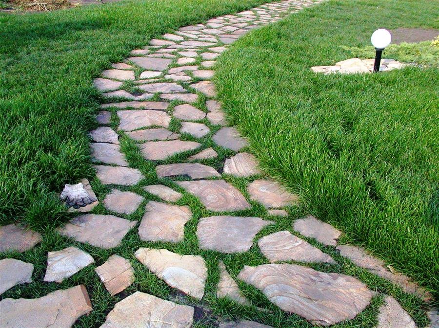 Чаще всего для оформления покрытия садовых дорожек используют плитняк, вернее, его разновидность – песчаник. Этот натуральный камень для дорожек и площадок встречается в природе во множестве оттенков: серый, серо-зеленый, желтый, рыжий и даже красный! Проще всего найти на строительном рынке светло-серый плитняк. Песчаник относительно недорог, легко обрабатывается обычной болгаркой, абсолютно безопасен для человека и гораздо прочнее керамической плитки.
