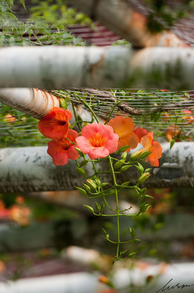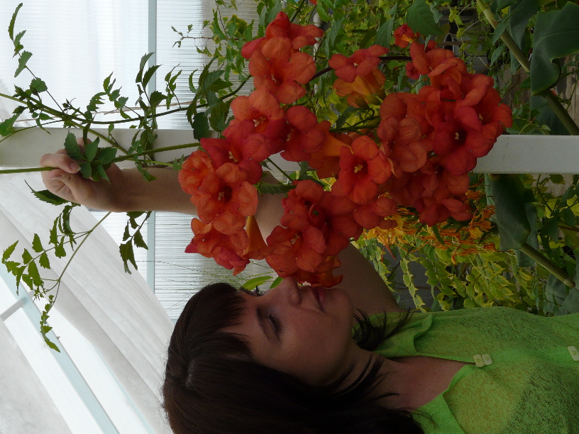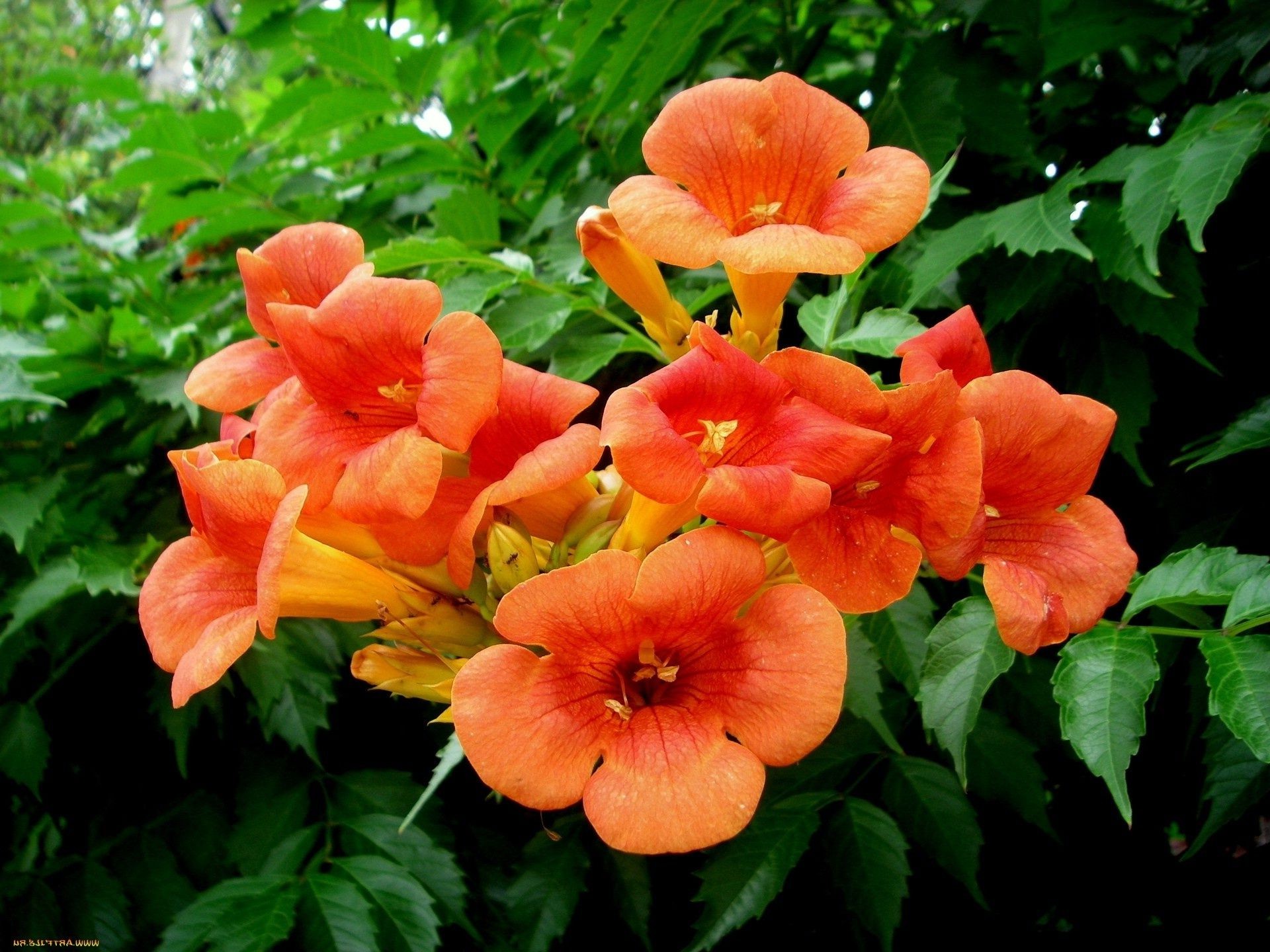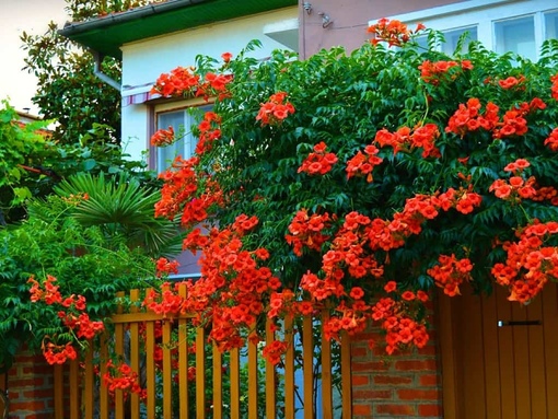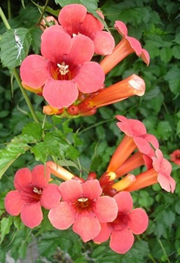 Campsis radicans или укореняющийся, более известный своим разговорным названием текома, имеет несколько разновидностей. Основные сорта, обдающие высокими декоративными качествами, применяются для вертикального озеленения стен и беседок. Также они используются для посадок на фигурных подпорах и на газонах.«Фламенко»
