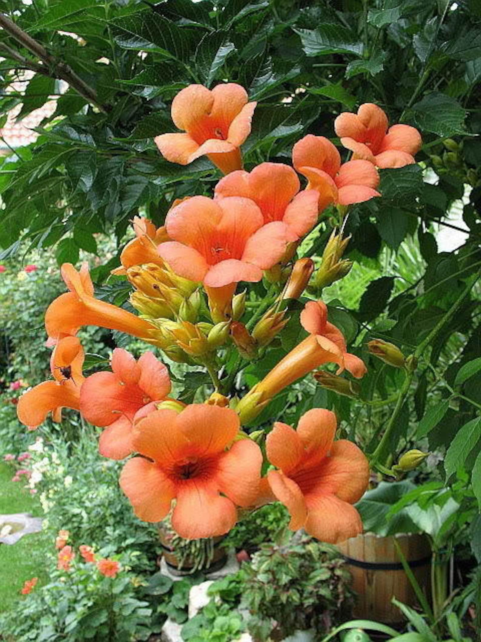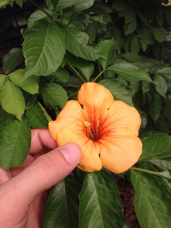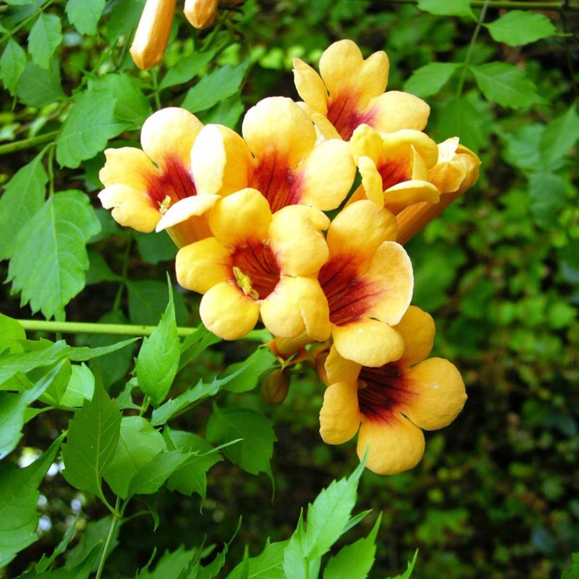 Кампсис укореняющийся представляет собой быстрорастущую лиану, высота которой может достигать 10-15 метров. Растение ценится благодаря ярким крупным цветкам. Они собраны в метельчатые соцветия по 10-12 штук и не имеют определенного запаха, но дают много нектара. Благодаря этой особенности текома привлекает насекомых и служит отличным медоносом.