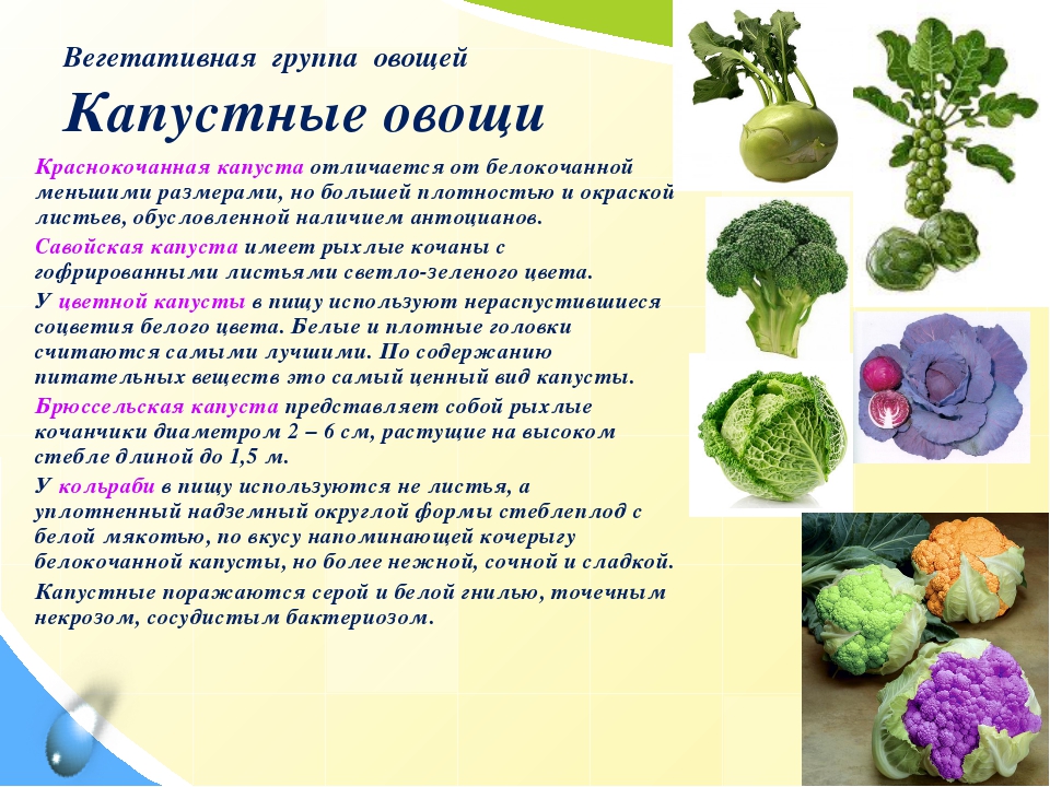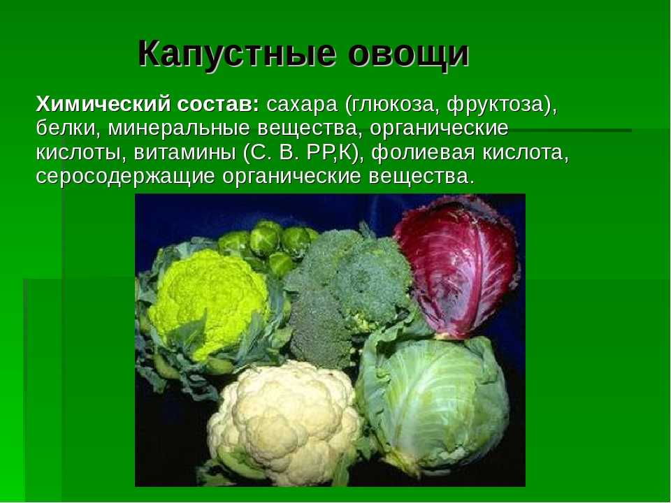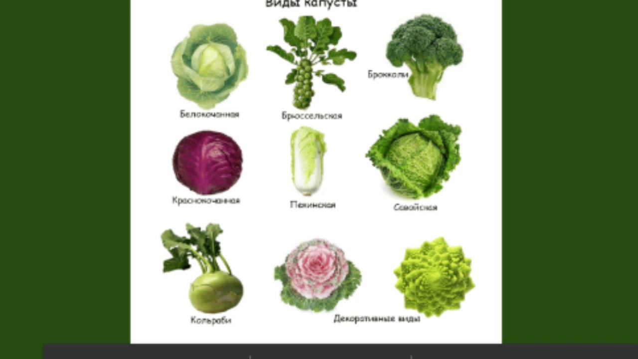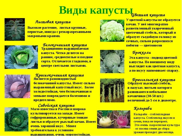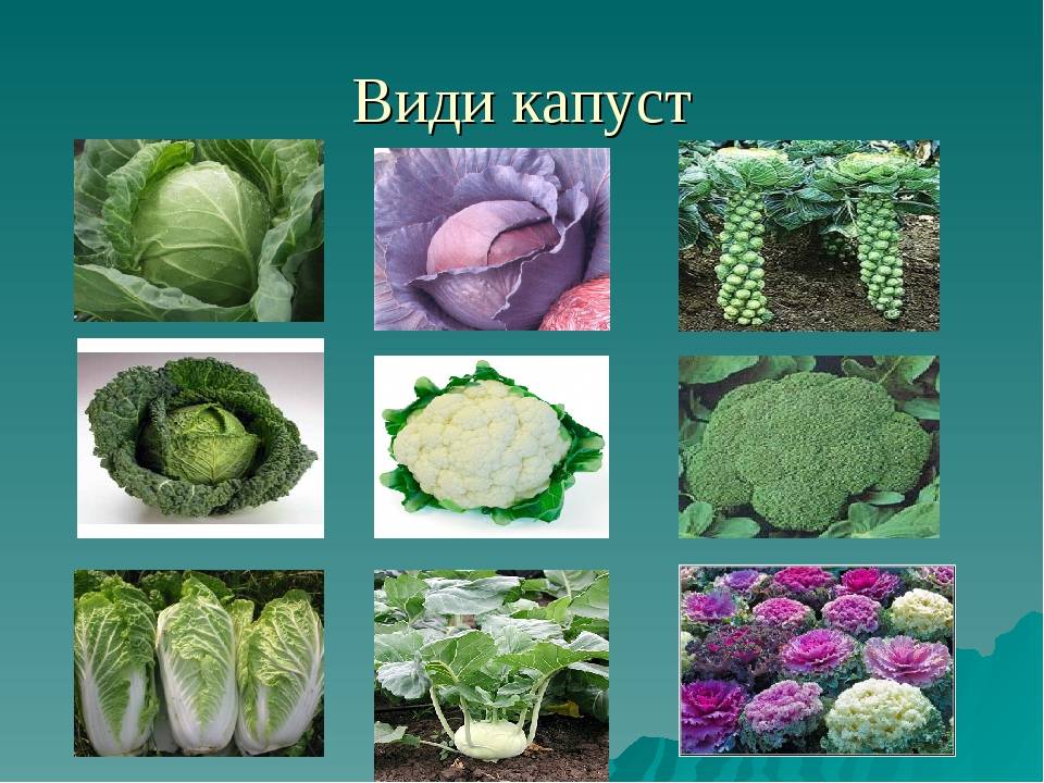 Капуста или Brassica oleracea включает многие виды капусты. Капуста обычно весит от 500 до 1000 граммов (от 1 до 2 фунтов). Гладколистная, зеленолистная капуста является наиболее распространенной, с пурпурнолистной капустой с гладколистной и жестколистной капустой обоих цветов.