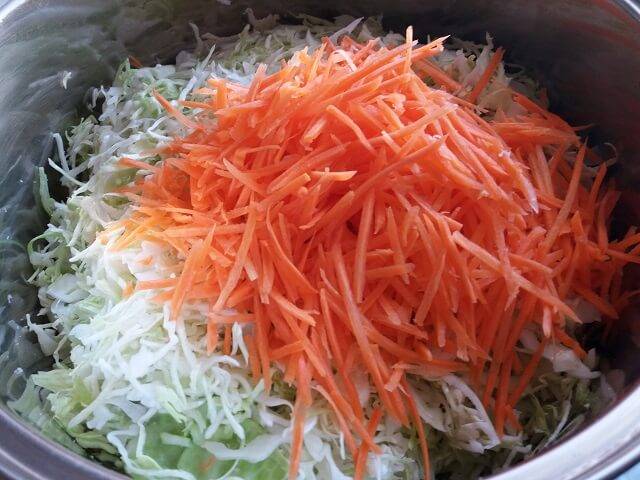 1Капусту крупно нарезать, морковь натереть на крупной терке, чеснок нарезать тонкими кружочками.