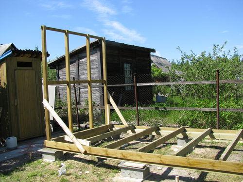 Выбор строительного материала зависит от того, на какой срок рассчитана пристройка. Если это временное сооружение, которое в дальнейшем будет перестраиваться, то разумно использовать недорогие материалы, можно использовать даже бывшие в употреблении. Каркас сбивается из бруса или толстой доски.