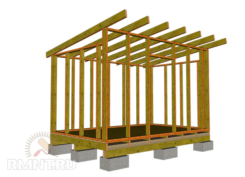 На уже готовом деревянном каркасе собираются стропила – основа под кровлю. Как правило, для этой цели используется брус сечением 100 на 50 мм и длиной, которая на 1000 мм превышает ширину хозяйственной постройки. Оптимальный шаг между соседними стропилами составляет 85 мм.