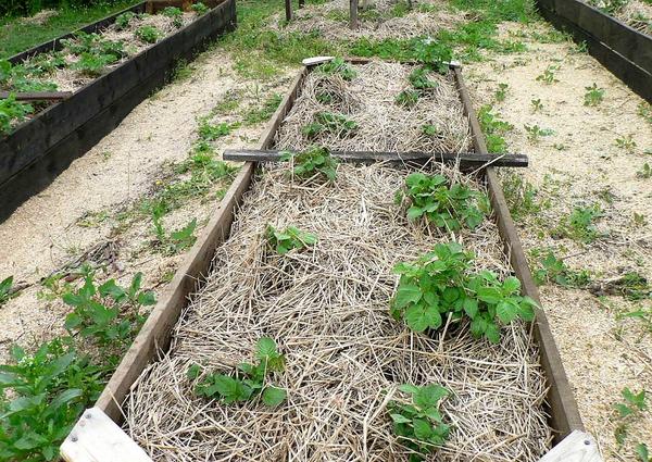 - Рядки укрывают сухой соломой слоем не менее 20 см. Если толщина укрытия будет недостаточна, под ним не будет поддерживаться достаточная влажность, а солнечные лучи озеленят молодые клубни.
