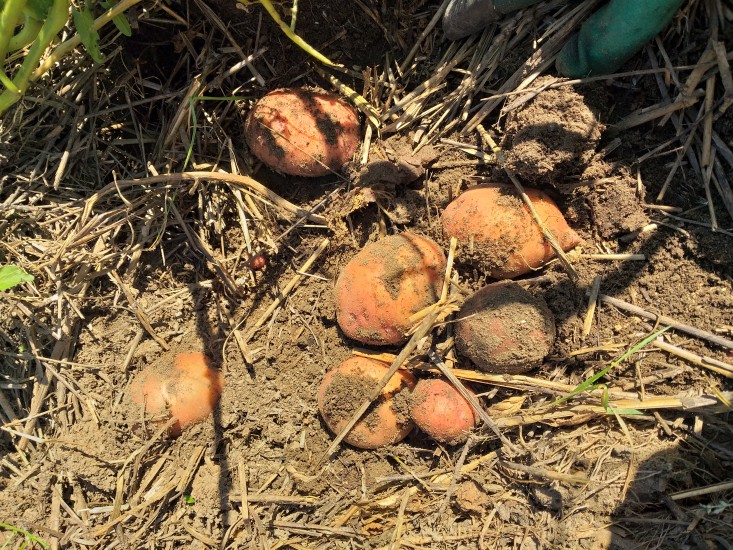 Это лучшая часть. Когда дни становятся прохладнее, а растения картофеля начинают выглядеть сухими и слегка коричневыми, наступает время сбора урожая. Отодвиньте мульчу, поднимите картон… и вуаля! Картофель! Копать не нужно — картофель просто лежит на поверхности почвы и ждет, когда его соберут.
