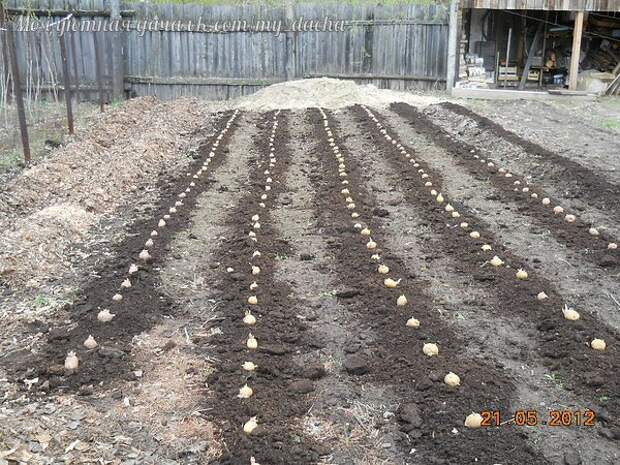 1. Пророщенные клубни раскладываются на теплой земле ростками вверх через равные промежутки. Расстояние зависит от того, какого размера и веса клубни взяли для рассады.
