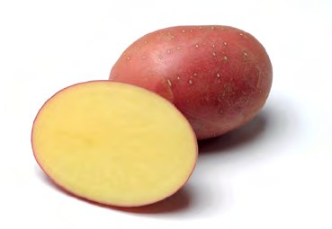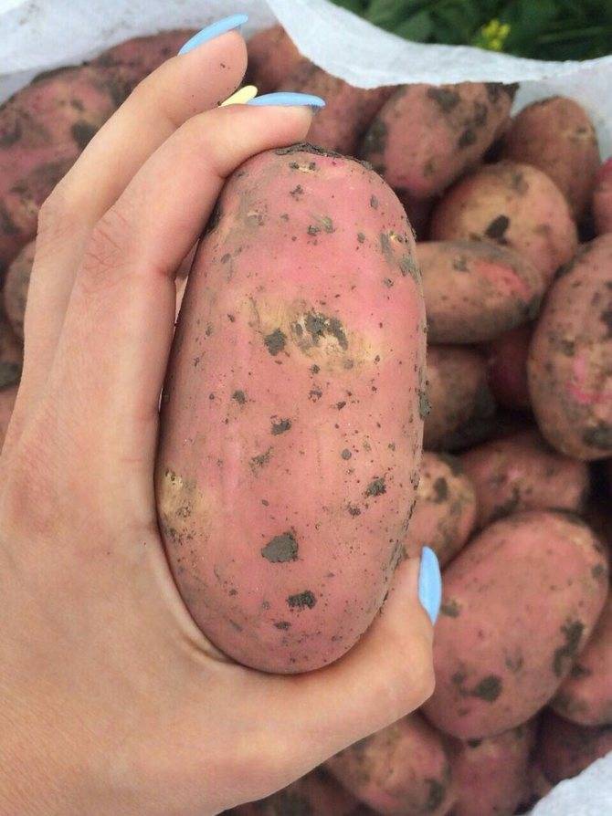 - Клубни достаточно крупные, весом до 150 г, окрашены в красноватый цвет, на срезе бледно-желтые, овальной формы и одинакового размера, выход мелкой нетоварной картошки минимален;