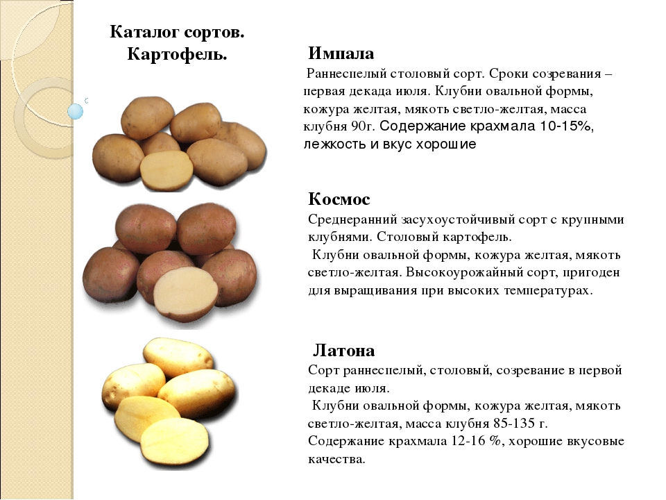 Картофель желтого цвета мяса съедобен, а картофель белого цвета — промышленного.Клубни могут быть круглыми, овальными и длинными. Оболочки клубней обычно светло-желтые, мякоть клубня желтая. Вес клубней колеблется от 50 до 500 гр.