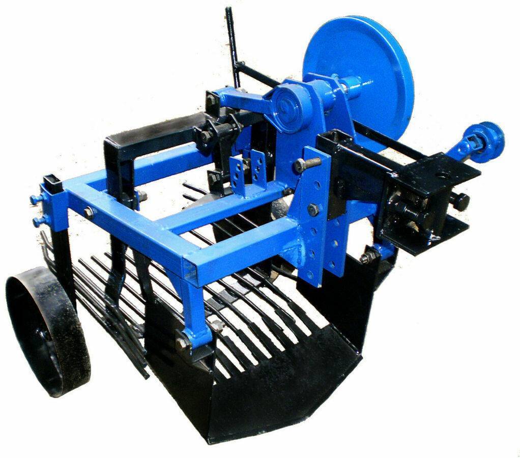 Картофельная копалка на тракторили мотоблок представляет собой навесное устройство, которое крепится на мотоблок или мини-трактор. Картофелекопалки имеют зубцы, которые во время движения вскапывают землю. В процессе движения по транспортеру, между зубцов агрегата остаются картофелины. Клубни автоматически либо помещаются в специальный резервуар, либо выбрасываются в междурядье. Устройство само выкапывает и очищает от земли урожай, его остается только собрать с поверхности земли.