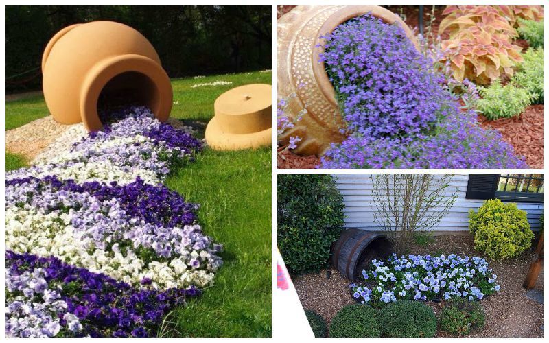 Либо простые горшки, закрепленные на вертикальной стойке, часто под наклоном. Если использовать ампельные растения, таким образом можно создать образ настоящих струй воды, которые как-бы перетекают из одной емкости в другую. Кстати, если вы решили устроить на участке сухой ручей, такой цветочный каскад — с петуниями, настурциями, бальзаминами — станет его выразительным началом.
