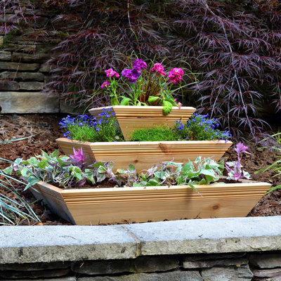 Для создания цветочного (или огородного) каскада можно использовать готовые модули из ярусно закрепленных кашпо. Уменьшение их размеров снизу вверх придаст каскаду пирамидальную форму. Одинаковый размер — колоновидную.