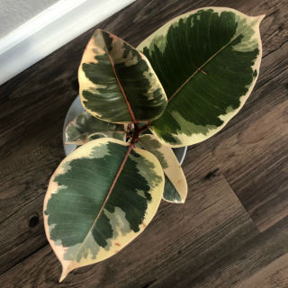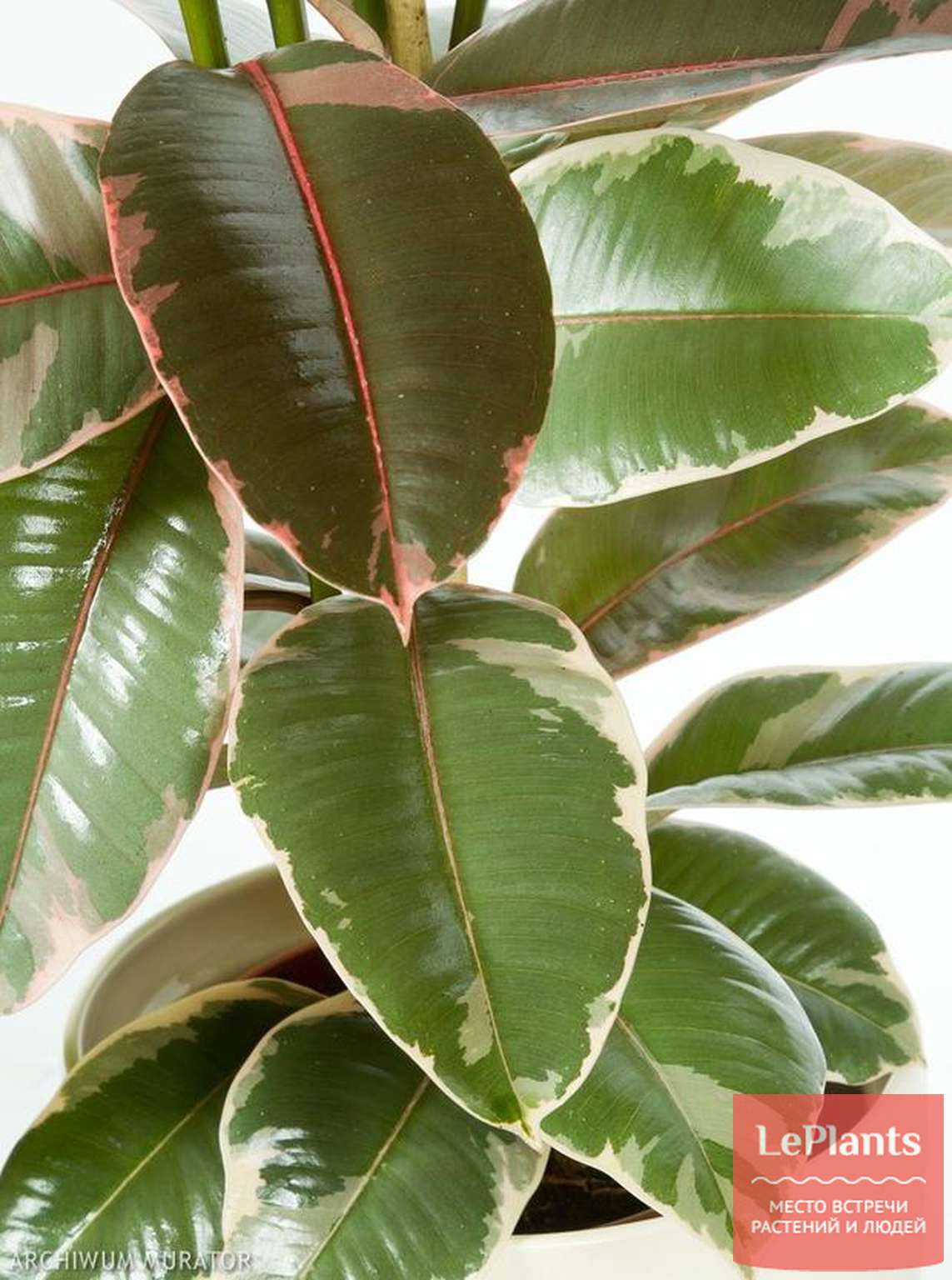 Молодая листовая пластина окрашена в красноватый цвет с выраженным бурым оттенком. Голландскими селекционерами выведены сорта фикуса каучуконосного с пестрыми листьями. Но они требуют более тщательного ухода. Цветки деревца не так красивы, да и редко появляются на комнатном растении, соответственно и плодов можно не дождаться.