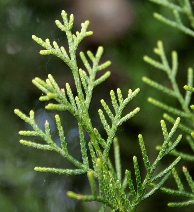 Ветки растут во всех плоскостях, круглой или четырехугольной формы. Листья чешуевидные, черепитчато прижаты к ветвям, со свободной тупой верхушкой, пересекающиеся под прямым углом, маленькие, яйцевидные, на тыльной стороне присутствует масляная железа в виде продольной борозды.
