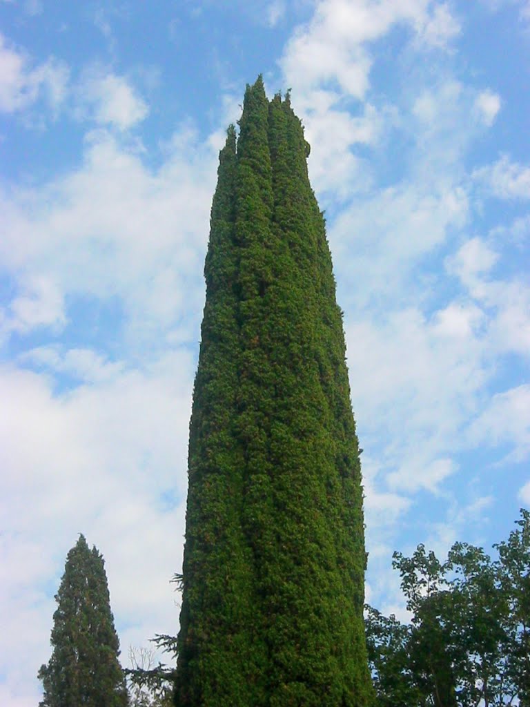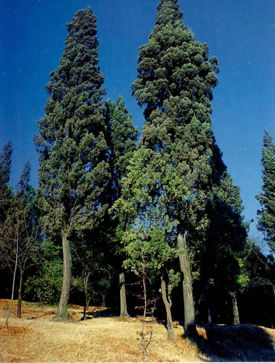 Кипарис вечнозеленый. Холодостойкое и засухоустойчивое растение в виде дерева до 30 м в высоту имеет пирамидальную крону. Оно состоит из восходящих, плотно прижатых к стволу веток. При этом толщина ствола не превышает 60 см. Молодые побеги покрыты мелкой чешуйчатой листвой тёмно-зелёной окраски.