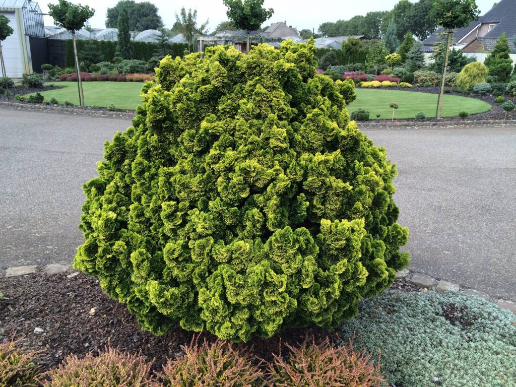 Прекрасная карликовая форма с полушаровидной формой кроны, в 10 лет 0.5 м. высоты, годовой прирост 3-4 см., взрослое растение достигает максимум в высоту до 1 м.