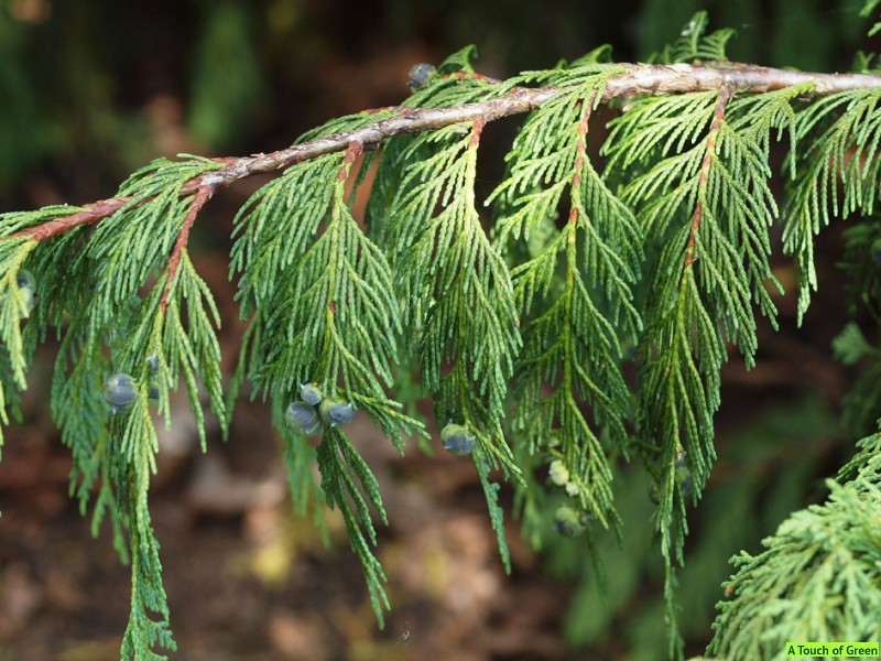 Ветви плоские, хвоя чешуйчатая, крестообразно расположена, с нижней стороны часто беловатая. Мужские цветки появляются в большом количестве и достаточно декоративны. Женские цветки расположены по одному на боковых ветках и малозаметны. Шишки мелкие (до 8 мм.), шаровидные, твердые, деревянистые, с выпуклыми чешуями, с острием или без него, созревают уже на первый год.