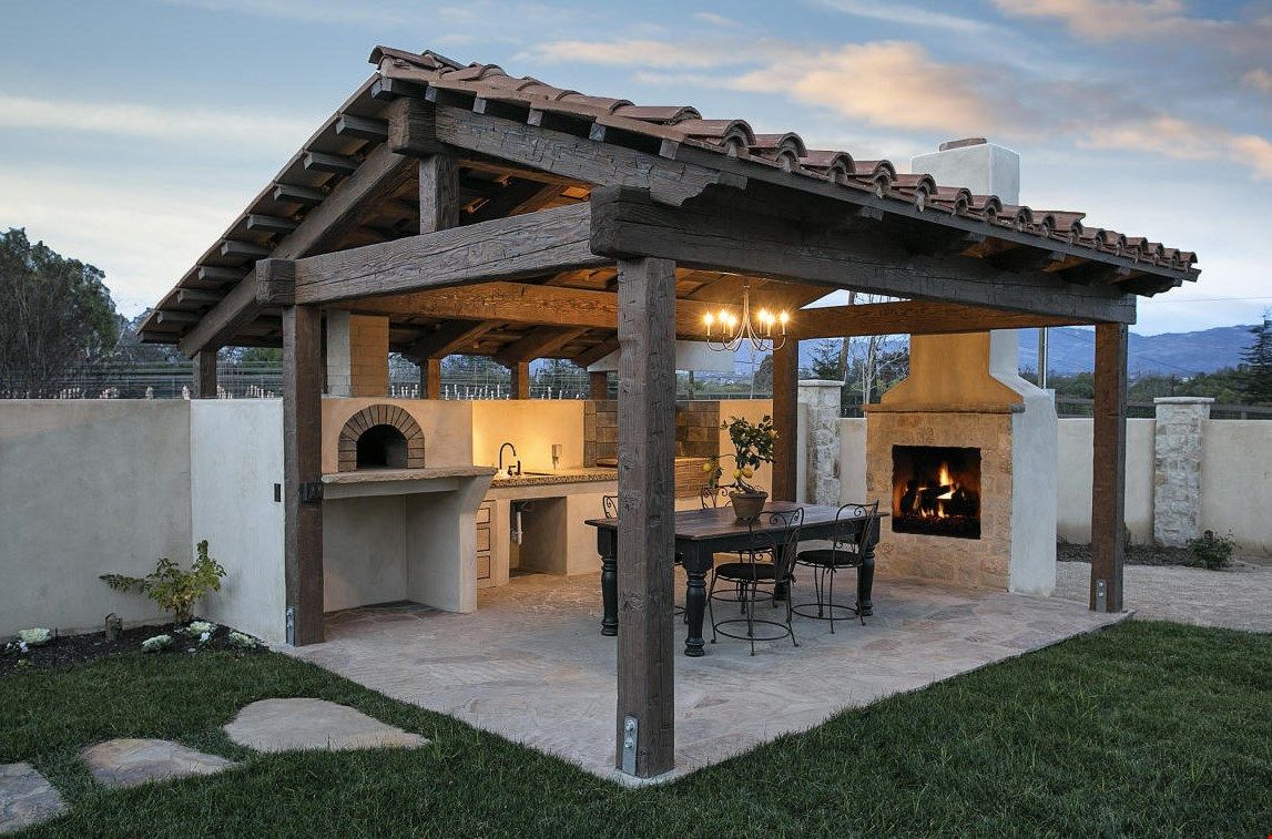 - Летняя зона кухни под навесом, расположенная у стены постройки.