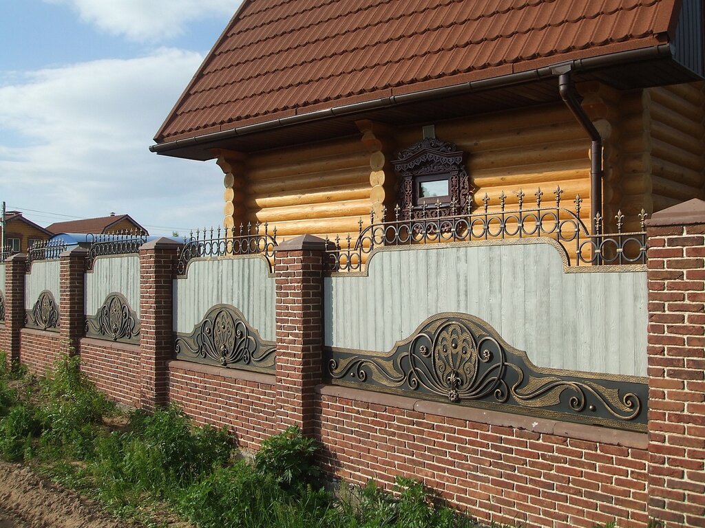 Это сделано первоначально для двух целей: декорирования и дополнительной защиты от воров. Небольшие металлические колья средней остроты существенно повышают эффективность забора против воров.Заборы, где ковка используется как полноценный компонент конструкции, называют комбинированными. Они применяются редко и популярны из-за внешнего вида, а не из-за своих защитных функций. В этом они существенно уступают сплошной стене из кирпича. Поэтому предпочтительнее строить обычный вариант, дополнив его элементами ковки в дальнейшем.