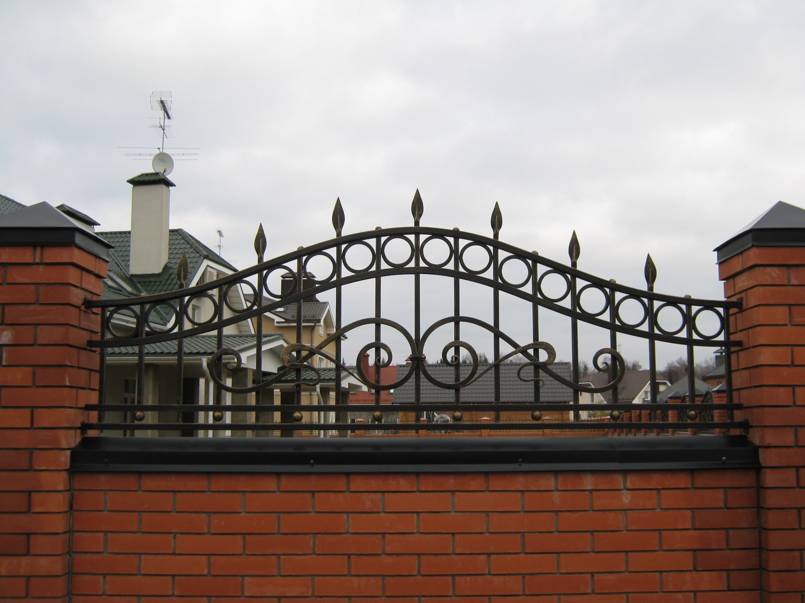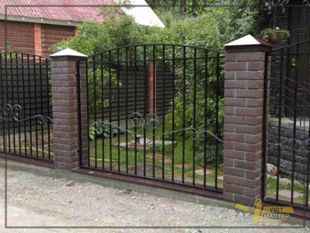 со столбами из кирпича, с коваными элементами, с полукруглыми секциями и цельные, с украшением сверху; все подробности