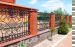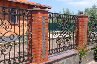 Забор из кирпича с элементами ковки представляет собой конструкцию, где соотношение двух материалов примерно равно. Столбы и нижняя часть забора, высота которой составляет примерно 1,0-1,5 м., выполнены из камня. Между колоннами располагаются кованые элементы. Такая конструкция надежно защищает собственность и выглядит очень эстетично. Подобные заборы являются оптимальным вариантом по долговечности и прочности, которую обеспечивает закладываемая в столбы арматура.