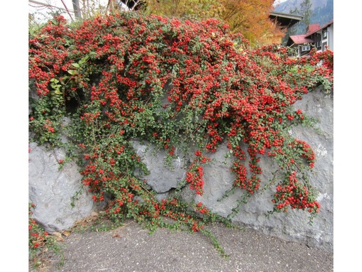 Данная разновидность кизильника является гибридной. Крона у такого кустарника раскидистая и очень красивая. Растение очень быстро разрастается, захватывая новые территории. Цветы у него светлые и малозаметные, а вот плоды яркие. Формой и окрасом они напоминают ягоды рябины. Плоды данной разновидности кизильника привлекают внимание многих птиц.