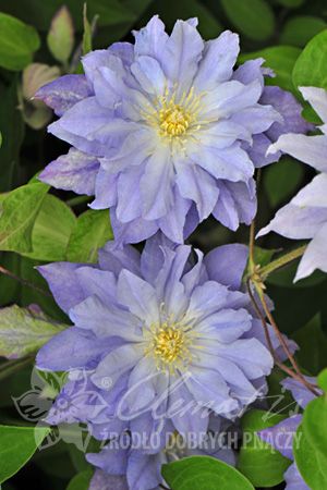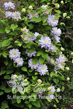 Листья клематиса светло-зеленые, тройчатые, сложные или одиночные, длиной – до 10 см. Венчики цветов в диаметре – 10-12 см, окрашены в бело-голубой цвет, по форме напоминают георгину.