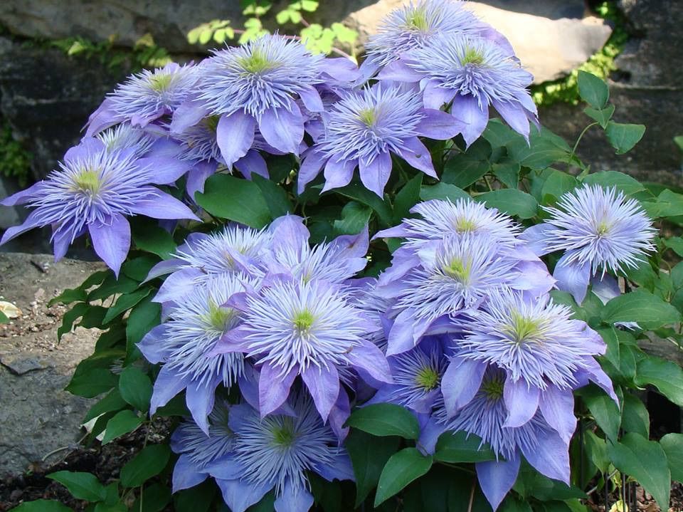 Frans van Haasterd, Голландия, 1998. Длина побегов: 2-2,5 м. Цветки всегда махровые, большие. Чашелистики лавандово-голубые, с темноголубыми прожилками. Цветение: V-VI, X. Группа обрезки: 2.