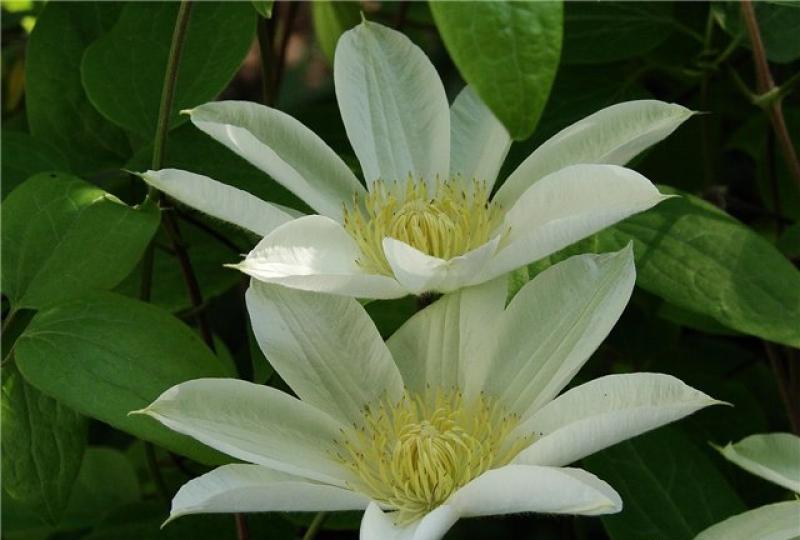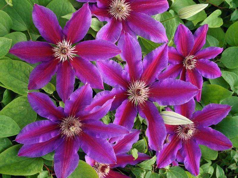 - Раннее крупноцветное Clematis имеет большие звездные цветы в начале лета, часто с вторым цветущим в конце лета