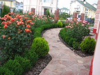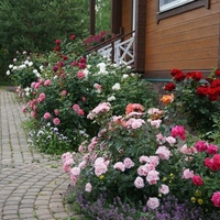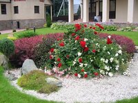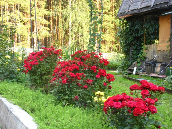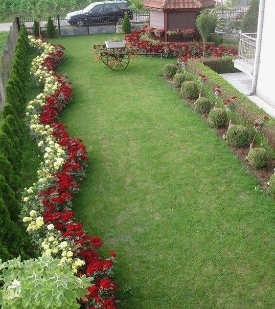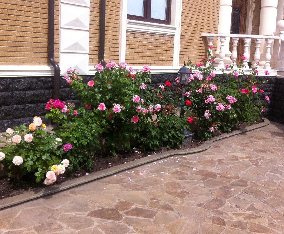 Яркие — на светлых. Но четких правил нет и все зависит от конкретной ситуации и ваших предпочтений. Главное, чтобы посадки не сливались с фоном. - На маленьком участке или вдоль дорожек лучше посадить низкорослые розочки. Особенно если тропинка изогнутая — маленькие цветы подчеркнут изгибы.
