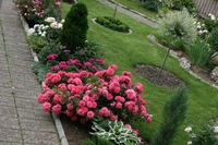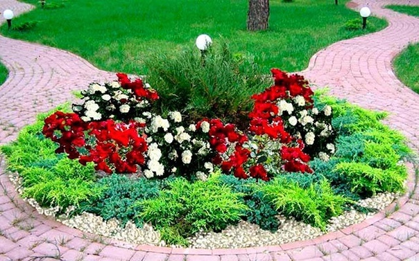 Клумбы с розами и хвойниками не каждому садоводу приходятся по вкусу, но такое сочетание вполне уместно. Подойдут компактные елочки «Литл Джем», сосны «Гном», самшиты, японские спиреи, барбарис, карликовые ивы, туи («Западная», «Смарагд», «Брабант», шаровидная), можжевельники Skyrocket, Blue Arrow, Moonglow. Благодаря вечнозеленым растениям, сад будет радовать, даже когда закончится цветение.
