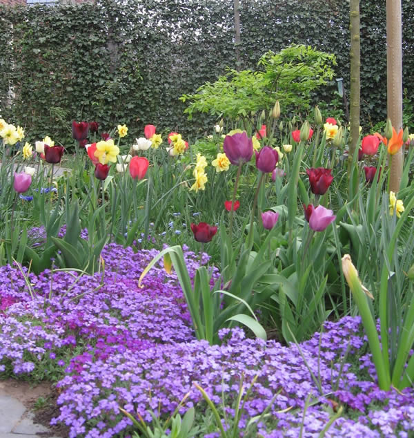 Если бы на приподнятой клумбе не было ничего, кроме тюльпанов, интерес был бы только в течение трех месяцев в году с марта по май. Поэтому, чтобы продлить период цветения, я также посадил перед бордюром ирис Кармен, который цветет в мае и июне.