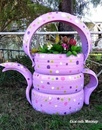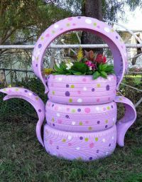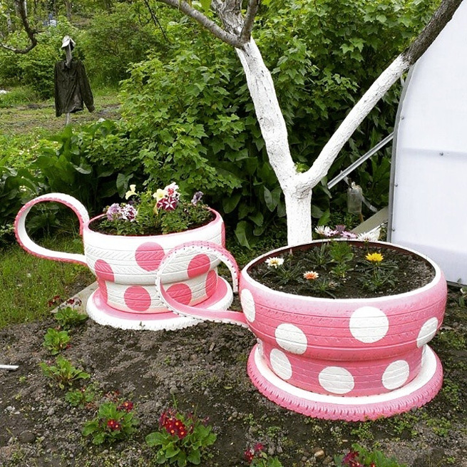Если у вас есть набор шин для хорошего использования в вашем саду, вы можете использовать их для создания тематических горшков, таких как эти кашпо для шин, которые выглядят как чашки и блюдца для чай или кофе. Для этого блюдце было сделано из шины, которая была разрезана пополам по всей самой широкой части протектора. Затем его перевернули, и края расширились, чтобы напоминать блюдце.