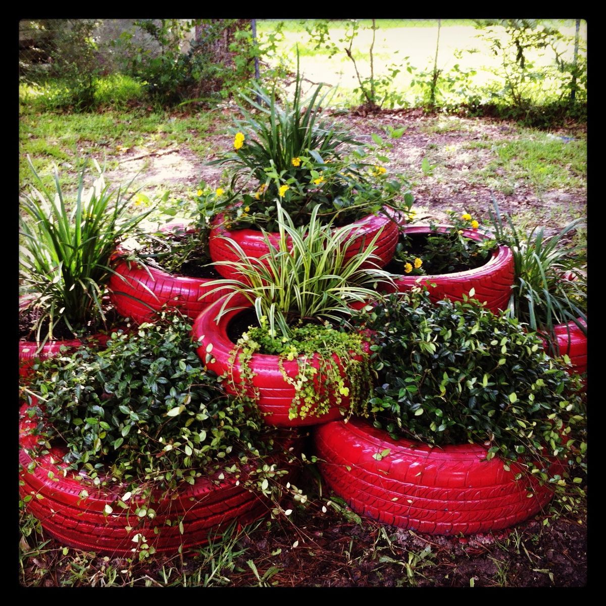 Эти шины были использованы для создания пирамидальной формы, которая может вместить множество цветов в промежутках между каждым кольцом.
