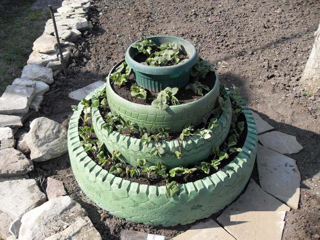 Еще одну отличную сеялку для небольших помещений можно сделать, сложив четыре колеса разного размера в виде пирамиды. Начните с по одной шине каждого из следующих размеров: шина сельскохозяйственного трактора; шина от большого грузовика; автомобильная шина; и шина для квадроцикла. Вырежьте из каждой боковину. Установите шину трактора в нужное место и засыпьте почвой. Расположите следующую по величине шину, грузовую, равномерно поверх шины трактора. Засыпьте его тоже почвой.Далее ставим автомобильную шину на место и заливаем. Наконец, поместите шину квадроцикла на кучу и засыпьте ее землей. У вас получится многослойный вертикальный сад, в котором выращивают клубнику, кустовые огурцы, разновидности невысоких цветов и многие другие виды растений. Приложив немного воображения, вы можете создать каскад растений, спускающихся по бокам этого кашпо.