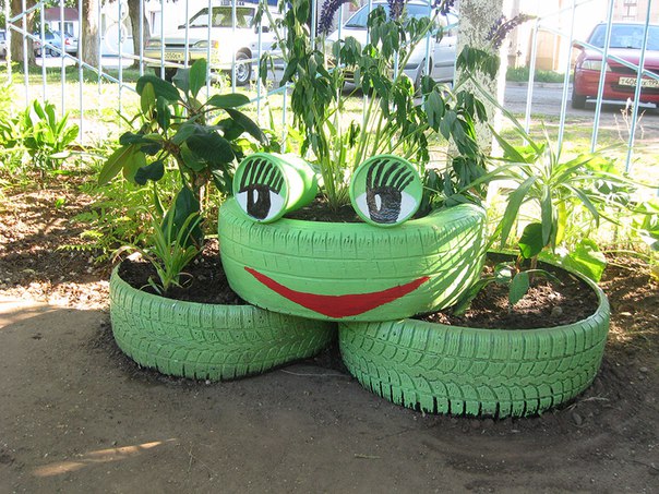 Эта идея хороша тем, что лягушку можно выполнить без трудоемкого разрезания металлокорда. Главное – не пожалеть насыщенной зеленой краски.