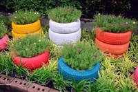 - Покрасьте все шины, используя малярную кисть или баллончик. Цвет выберите такой, чтобы он хорошо сочетался с теми растениями, которые планируется высадить.
