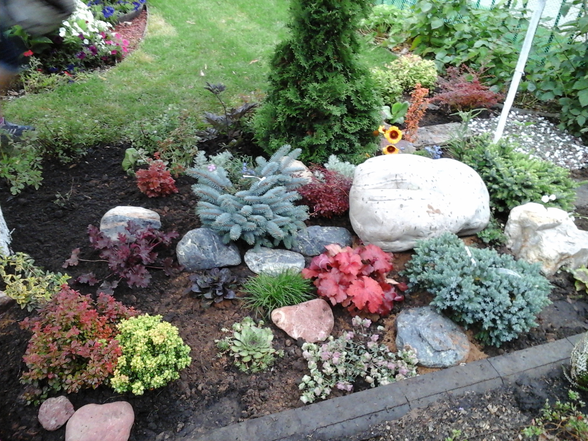 - В качестве базы для клумбы служит газон и альпийская горка;
