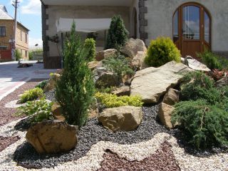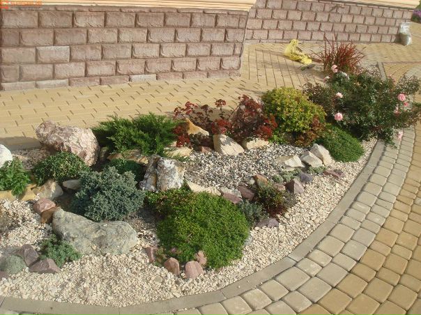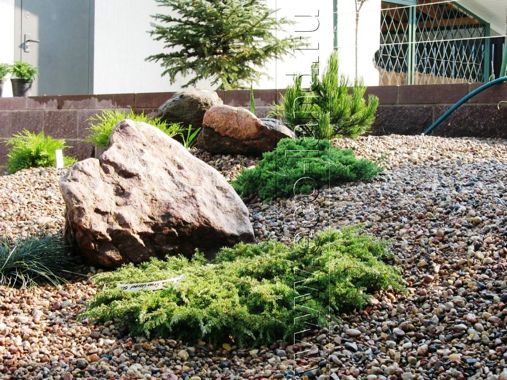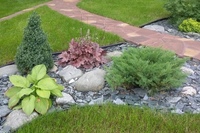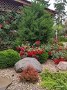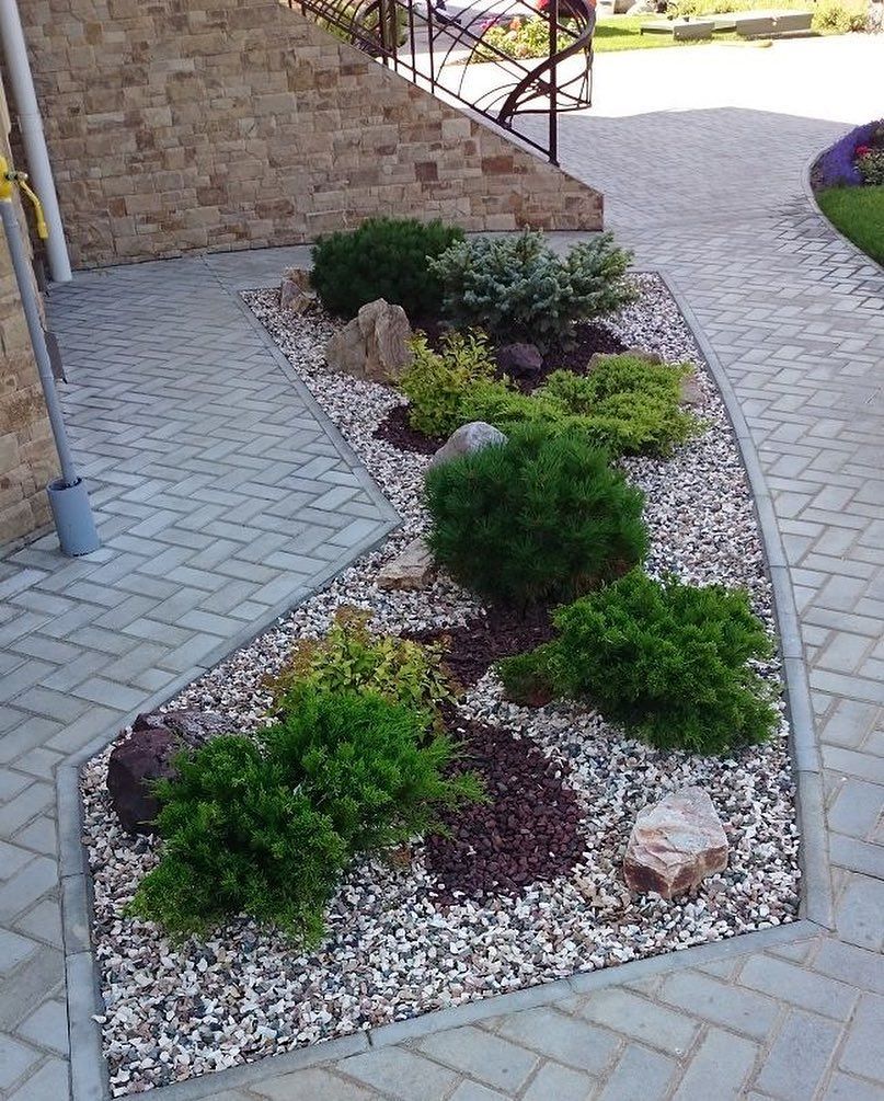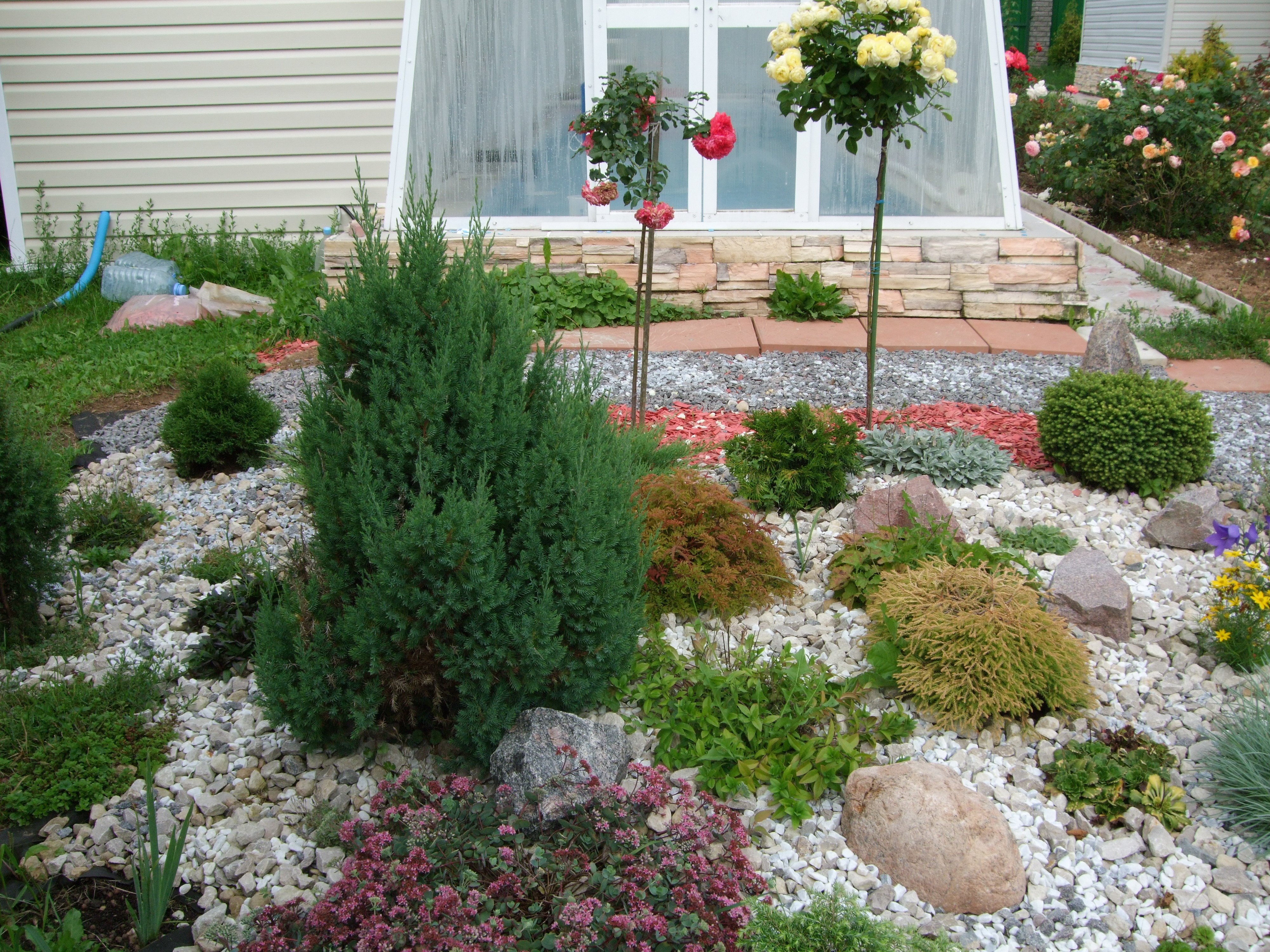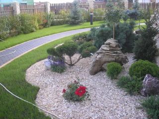 Гравий, щебень фракцией до 50 см отлично смотрится в композициях с древесными кустарниками, хвойными растениями, розами.