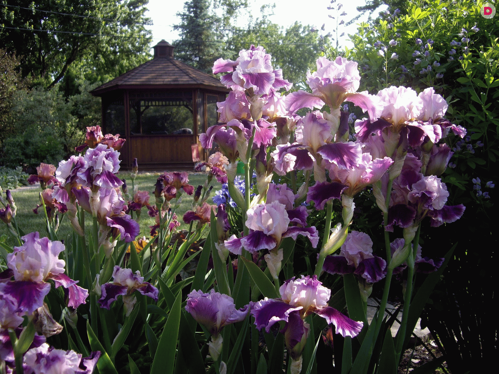 Сад рекомендуется оформлять так называемыми бородатыми ирисами — удивительно красивыми и яркими цветами, лепестки которых могут иметь как однотонную окраску, так и содержать несколько разных оттенков. Особенно оригинальными будут переливчатые ирисы с цветами, перетекающими из одного в другой, и окаймленные — с каймой иного цвета по краям.