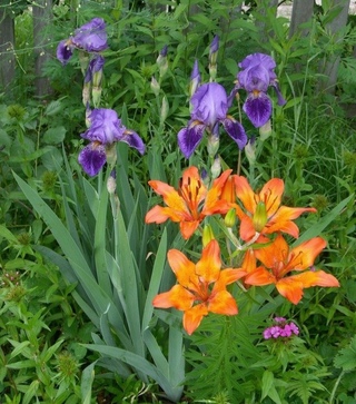Ирисы хорошо сочетаются с растениями других видов при условии, что корни этих растений будут располагаться в глубине почвы. Причина в особенности корневой системы самих ирисов: она проникает в почву неглубоко, на уровне верхних слоев, и поэтому не должна пересекаться с другими корнями. Проверенное временем сочетание — ирисы и кусты спиреи. Эти растения не только полностью совместимы друг с другом, но и великолепно смотрятся вместе. Вы сможете самостоятельно создать многоугольную клумбу со стороной 20 сантиметров, высаживая ирисы по углам, а спирею — в середине, в качестве фона. Распределите ирисы по цвету: несколько цветов с одинаковой окраской, посаженных рядом, составят замечательную композицию.