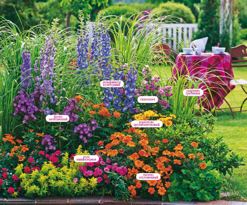 Как оформить клумбу из многолетников и декоративных цветов, чтобы цвела все лето: схема для ландшафтного дизайна с названиями