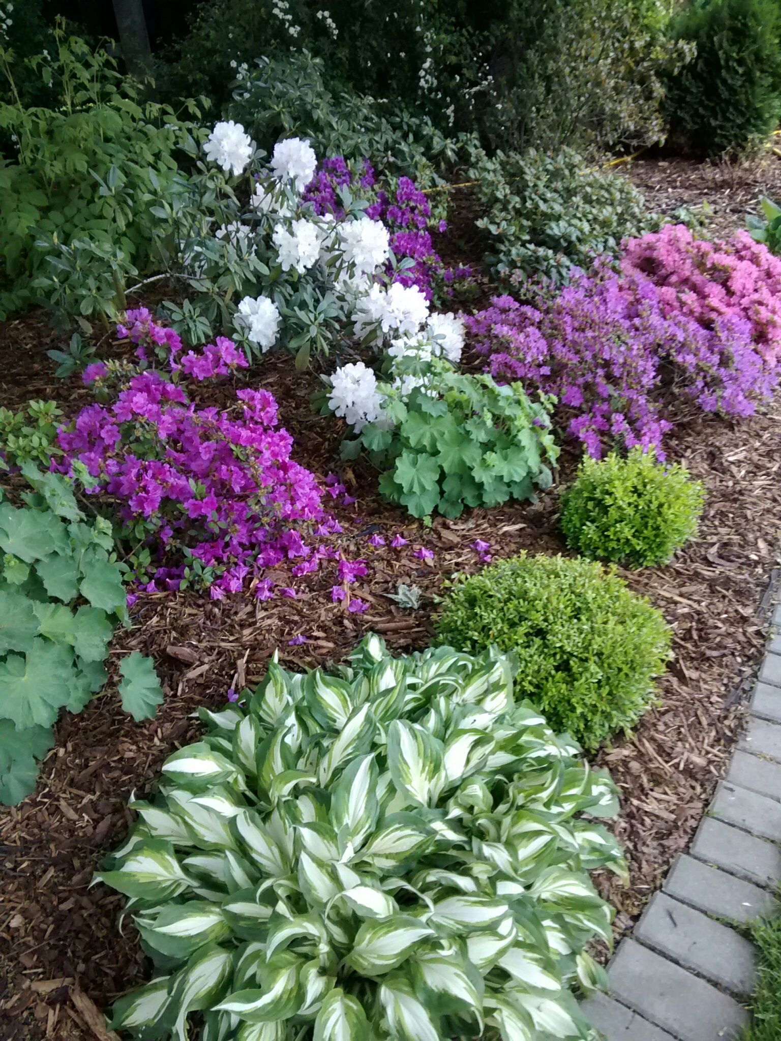 В середине можно расположить нецветущие многолетники. Они разбавят слишком яркую обстановку в пик цветения миниатюрных культур.