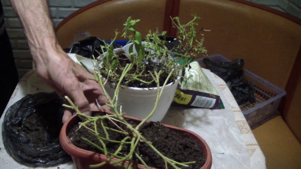 Пересаживать растение нужно до первых заморозков. Подходящее время — сентябрь — начало ноября. Куст выкапывают и помещают в горшок. При пересадке срезают сухие и поврежденные ветки. Некоторые садоводы практикуют кардинальную обрезку: все побеги укорачиваются до 10-15 см.