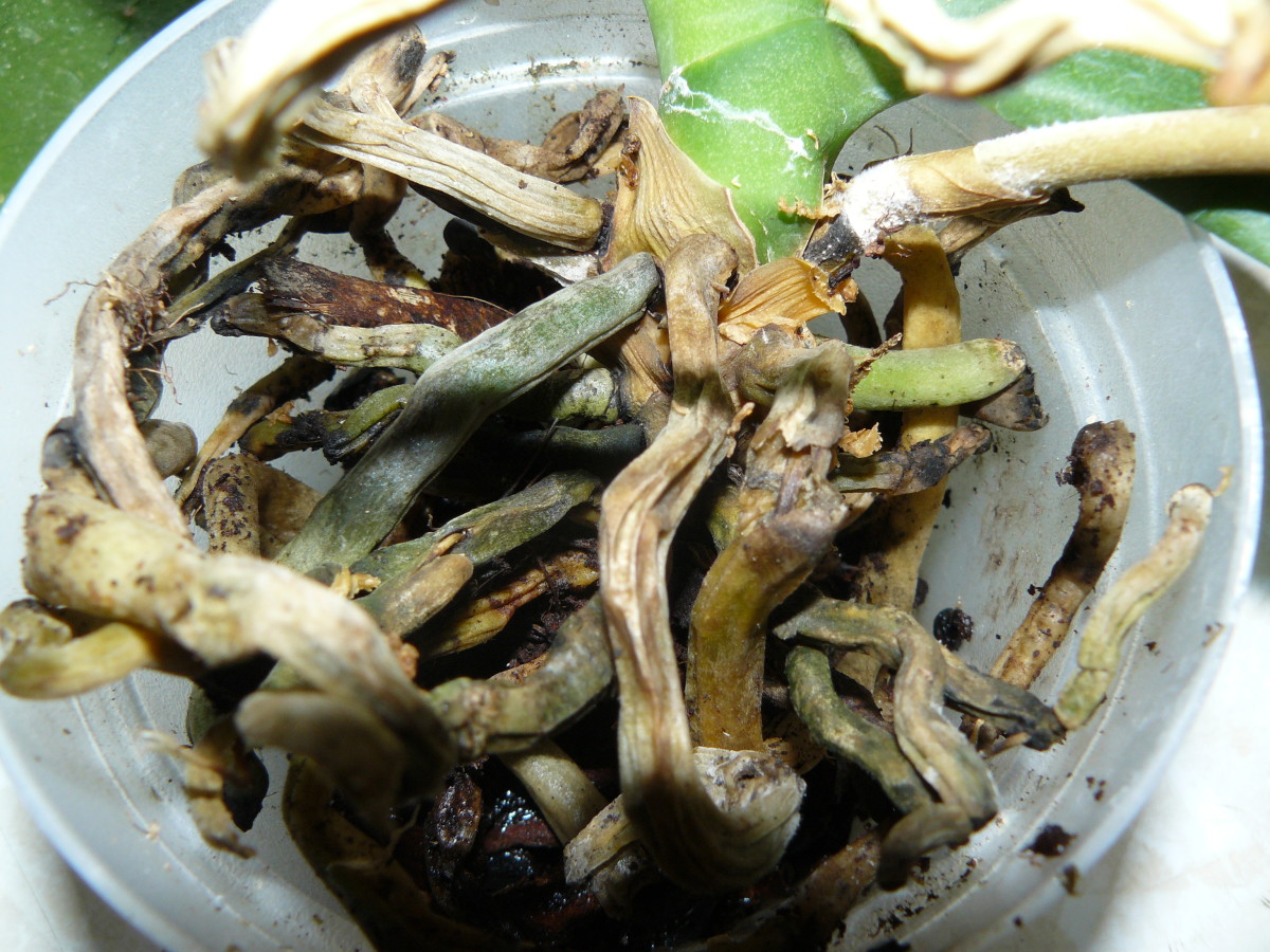 Чрезмерный полив орхидеи чрезвычайно опасен для здоровья растения. Слишком много воды препятствует доступу кислорода к корням. Корни орхидеи, подвергшиеся чрезмерному воздействию воды, начинают гнить, приобретая коричневую или черную окраску, и становятся чрезвычайно мягкими. Осмотрите корни орхидеи, ищите коричневые, мягкие, гниющие части.