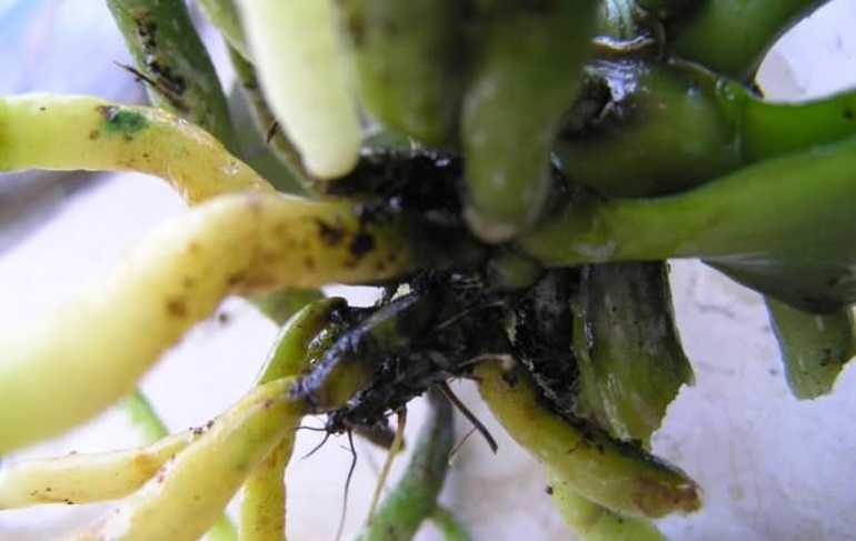 Корни орхидеи, подвергшиеся чрезмерному воздействию воды, начинают гнить , превращаясь в коричневый или черный цвет, и становятся чрезвычайно мягкими.