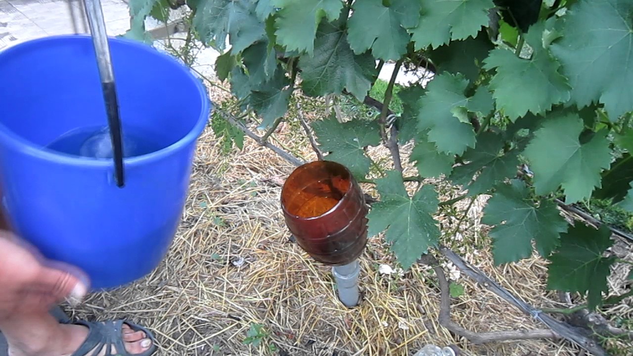 - Чтобы избежать перерасхода воды для полива виноградника, при посадке вкапывают пластиковую трубу у каждого куста. Так удается в будущем дозированно заливать воду с подкормкой.