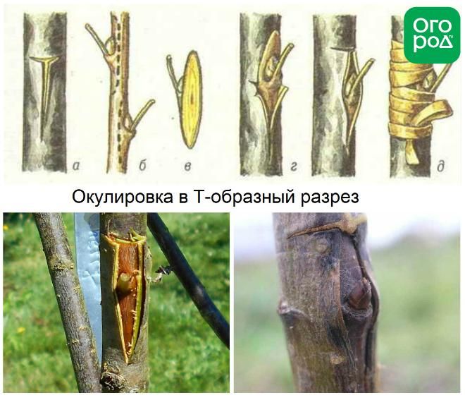 На коре подвоя делают разрез в виде буквы Т. Почка срезается со щитком из коры. Этот щиток заправляется в разрез и прививка фиксируется обвязкой. Для проведения окулировки выбирают северную сторону подвоя. Важно делать все надрезы чистым ножом, если почка нечаянно упала на землю, поднимать её не нужно, для прививки срезают другую почку.